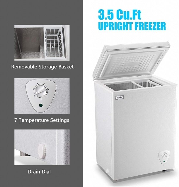 LARGE CAPACITY SIZE: 3.5cubic feet of compact freezer is a space-saving design. Contains a hanging movable freezer organizer, you can easily find yogurt, fruit, snacks or ice cream.