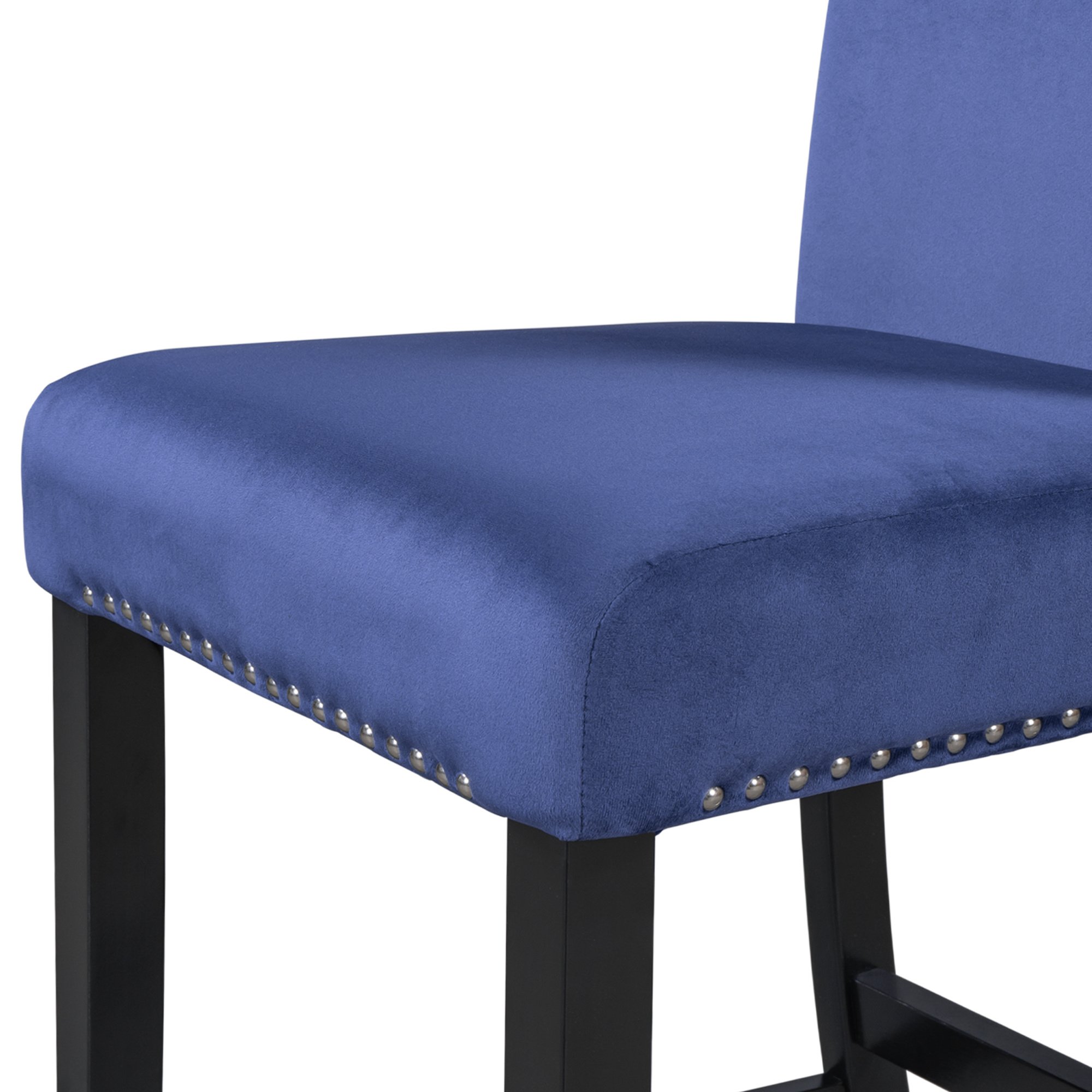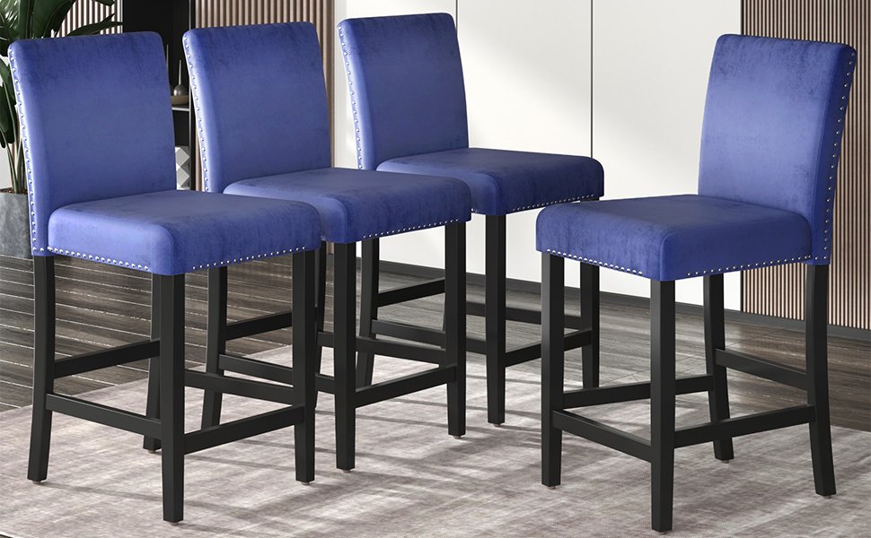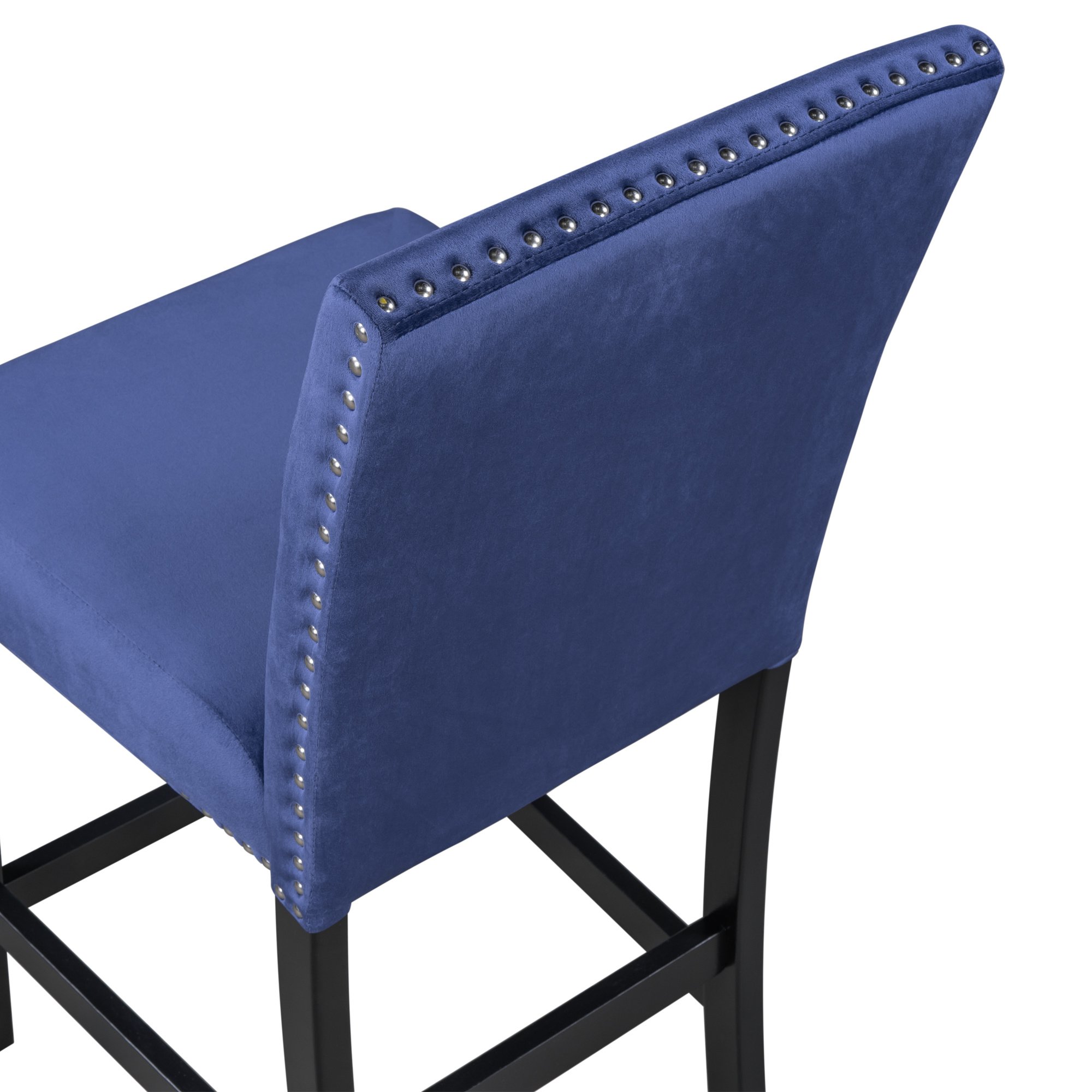 1.Modern Small Places Design:this graceful counter height dining chair is designed for small places. All of the chairs can be stacked under standard table when not in use to save space. Featuring with classical black coating and creative blue cushions as well as silver decorated nails.