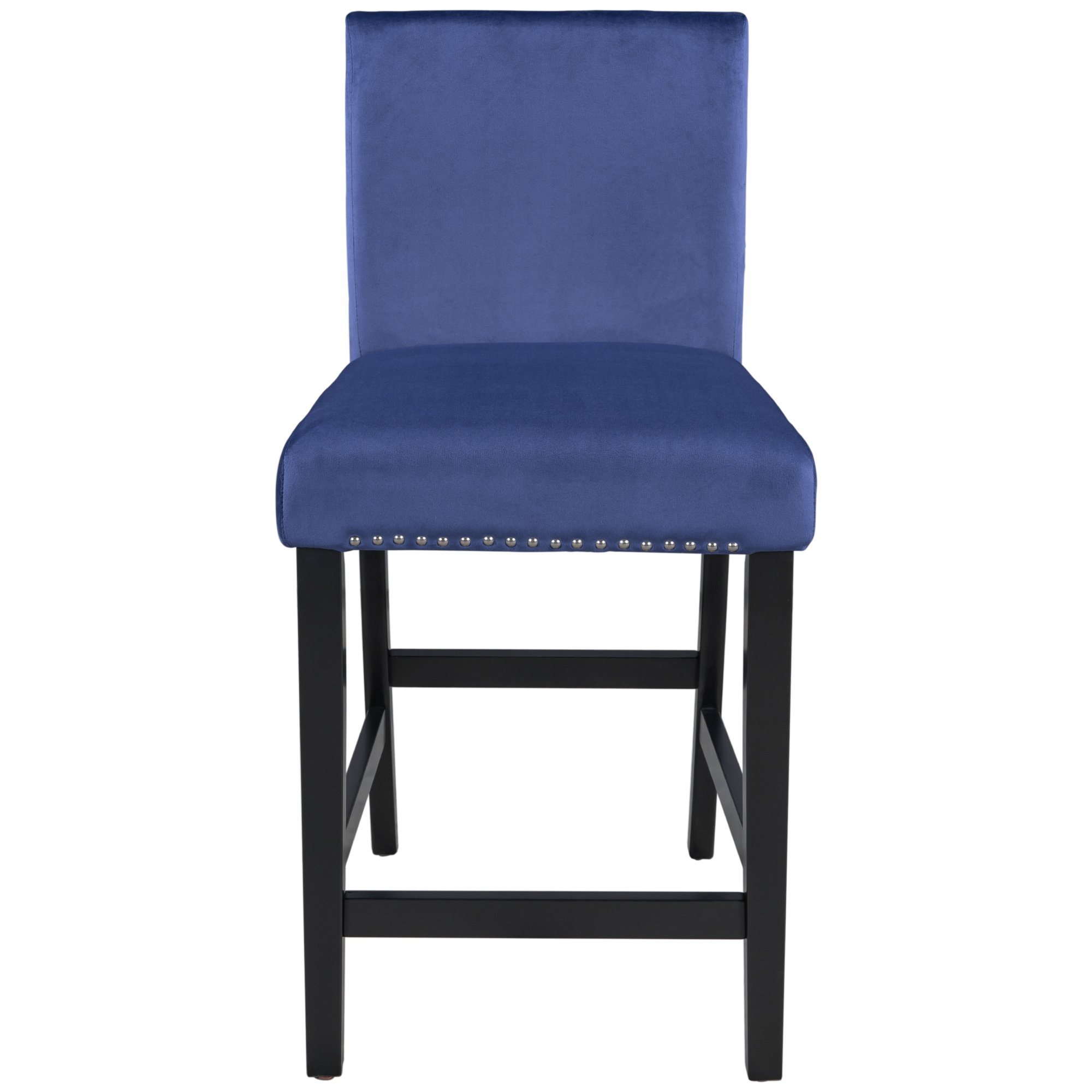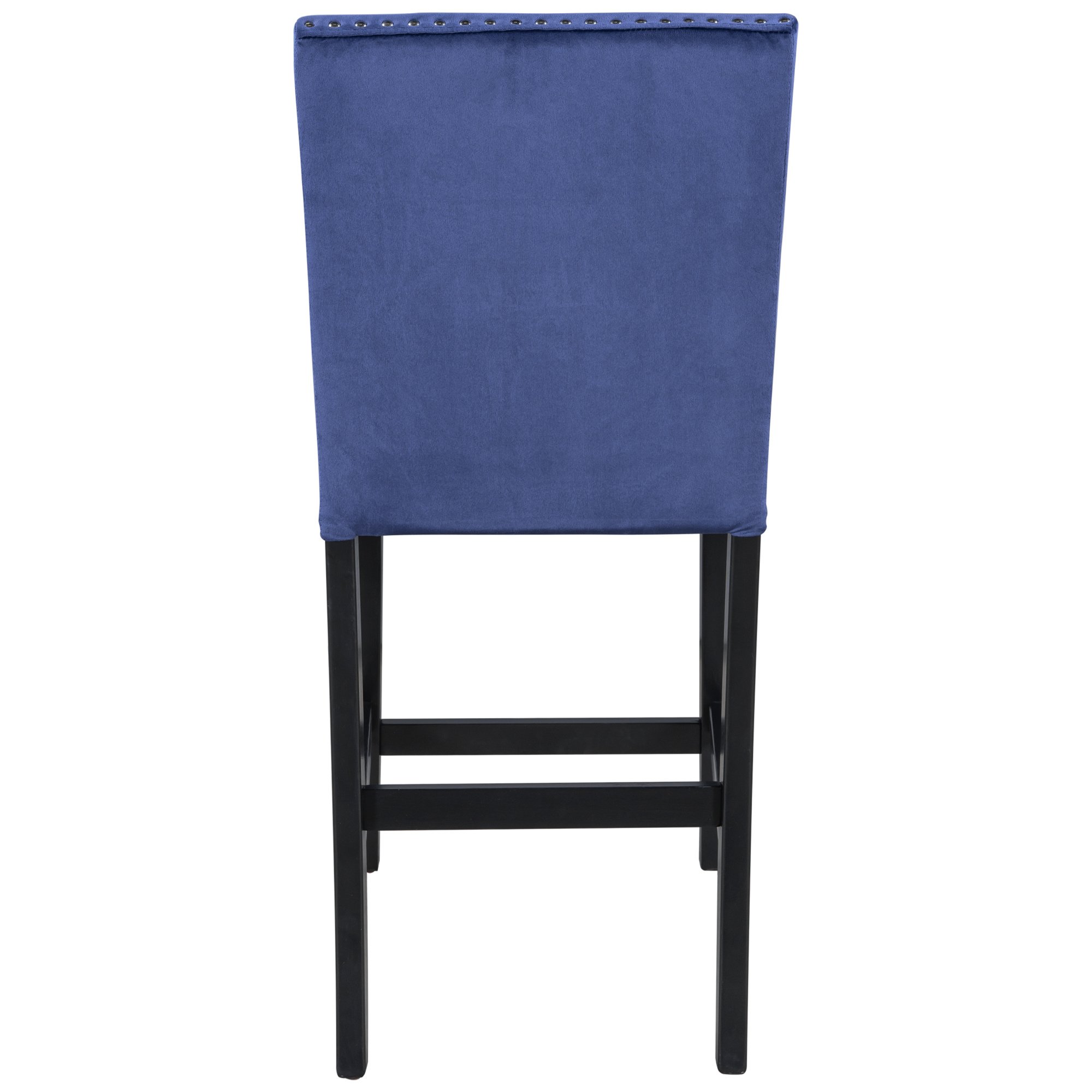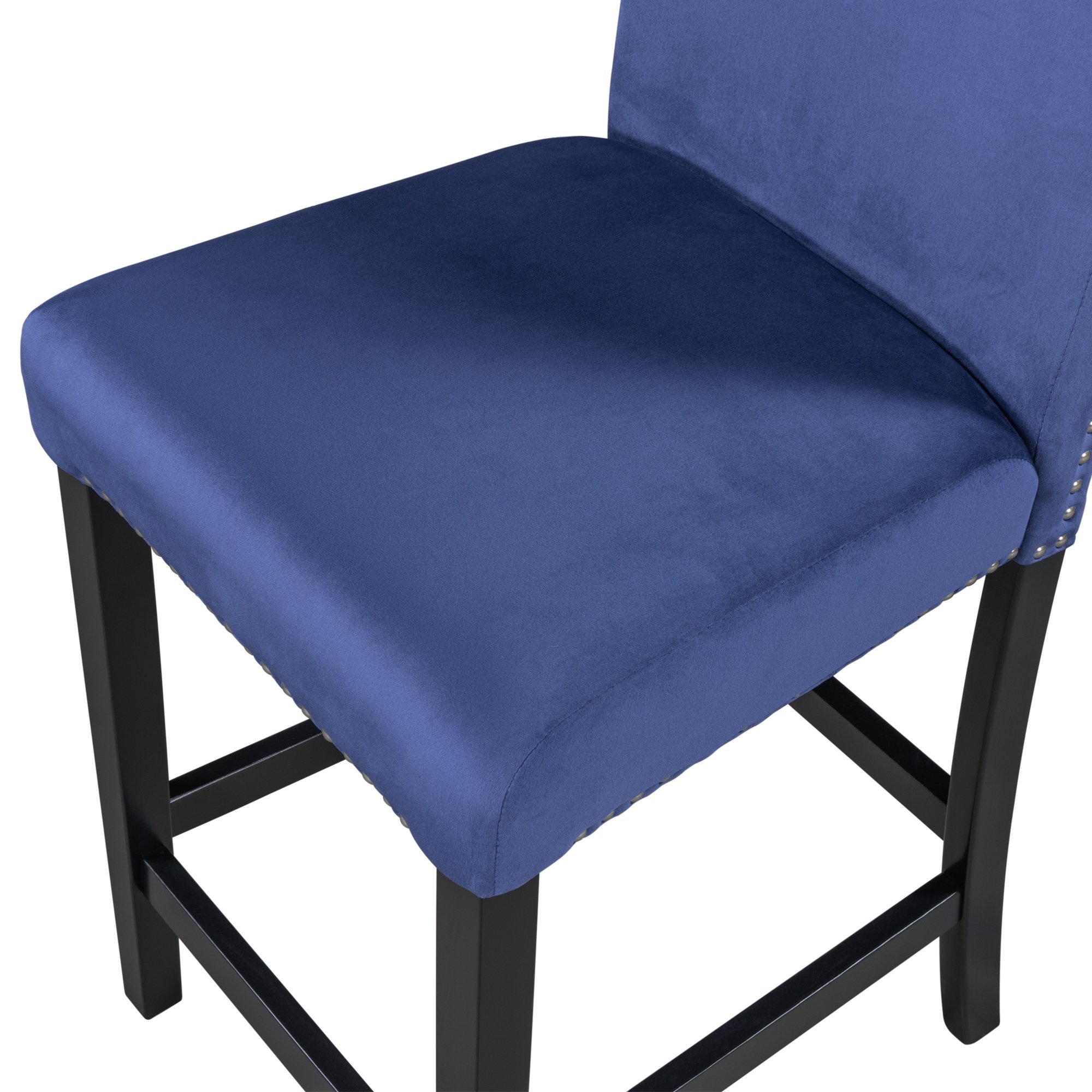 1.Modern Small Places Design:this graceful counter height dining chair is designed for small places. All of the chairs can be stacked under standard table when not in use to save space. Featuring with classical black coating and creative blue cushions as well as silver decorated nails.