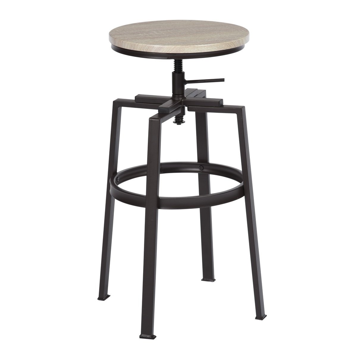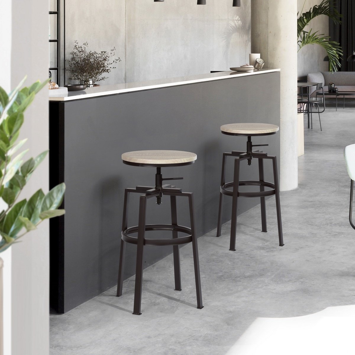 Backless Adjustable Height Bar Stools with Metal Legs; Oak seat; Set of 2
