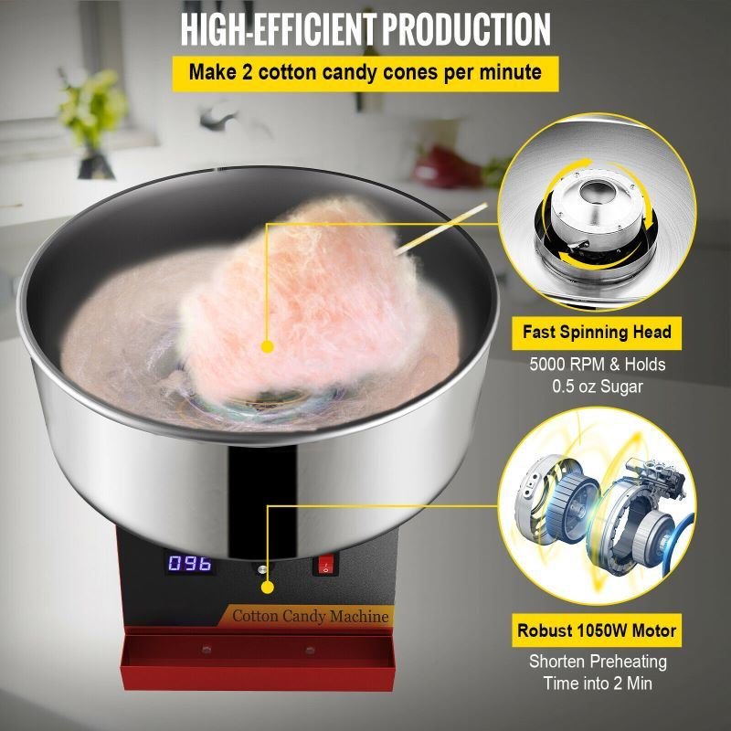 [Meet Your Commercial Needs]: Our commercial cotton candy machine adopts a 1050W motor, which only requires 2-minute preheat time, ensuring rapid cotton candy cones production; The spinning head, with 5000RPM rotating speed, can store 0.5 oz / 15g sugar at one time and product 120 cotton candy cones per hour, satisfy your large output demands.